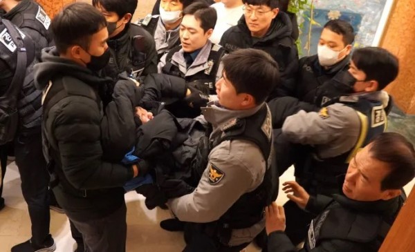 대통령의 경남 타운홀미팅 나흘 전인 2월 2일 경찰이 서울 세종호텔에서 고진수 지부장을 연행하고 있다. [사진=세종호텔 정리해고 철회를 위한 공동대책위원회]