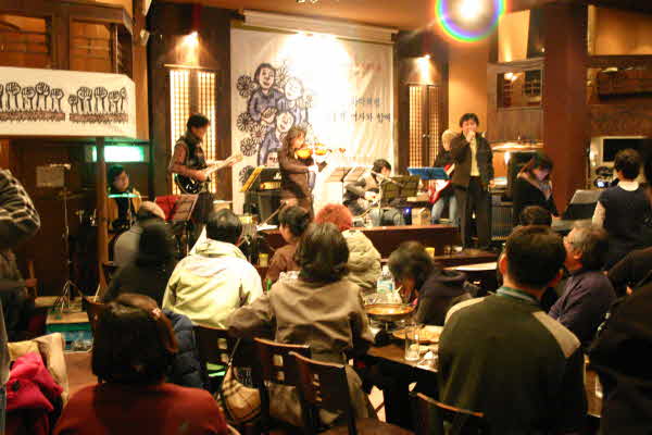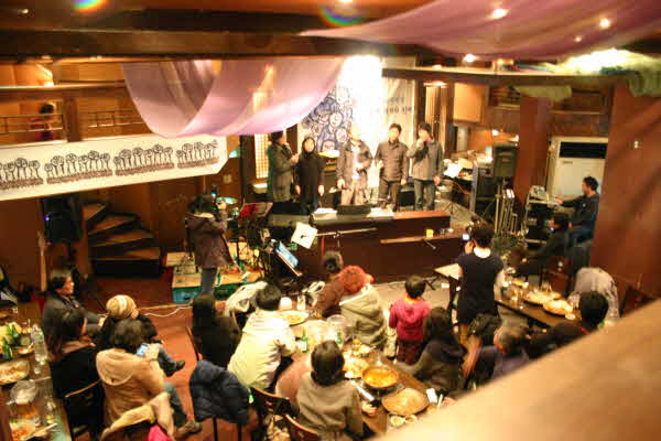 밥을 먹고 술 한잔 하면서 공연 시작. 어느새 100여 명이 훌쩍 넘어섰고...