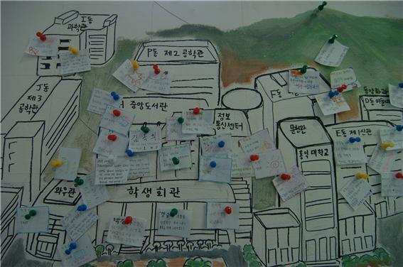 우리가 사진처럼 보고 있는 저 기록물은 사진이 아니다. 가로 1800cm에 세로 120cm의 크기의 나무합판 위에 홍대 미대생들이 그려 준 학교 조감도 실물이다. 우리 눈에 보여도 보이지 않는 듯, 유령이 아닌데도 유령취급을 받았던 노동자들의 이름과 그들의 일터와 이제야 오가기 시작한 마음을 노동자와 학생들이 직접 표시한 것이다.