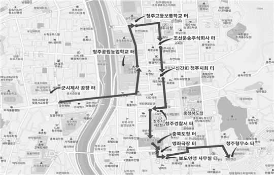 일제 식민지 시기 청주 시내 학교, 공장, 기타 공공기관 자리 |