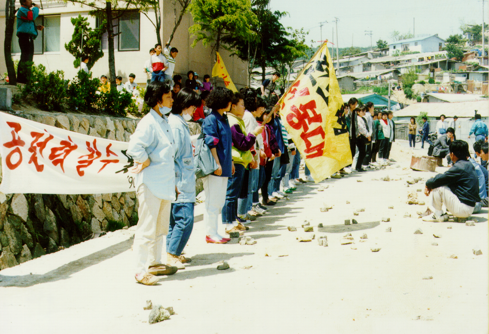 오늘 소개할 사진은 1990년 서울의 한 철거지역에 지원투쟁을 나선 전노협 선봉대원들 모습니다. 당시 철거 현장에서는 갈 곳 없는 도시빈민들이 짱돌과 화염병을 들고 쇠파이프와 식칼을 휘두르는 깡패들과 맞섰습니다. 여성 노동자들이 많이 보이는데, 실질적 도움이 되었을까? 그런 의문은 큰 의미가 없는 것 같습니다. 그 때 그 곳에 함께 한다는 게 연대의 시작이니까요.