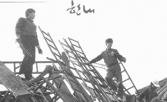 1990년 4월 27일. 현대중공업 노동자들이 정문에 바리케이드를 쌓고 있다. 경찰병력이 침탈할 것을 대비해 스스로를 보호하기 위해서였다. 모두 힘을 합쳐 사다리를 나르고 있다. 그 와중에 담배를 입에 물고......