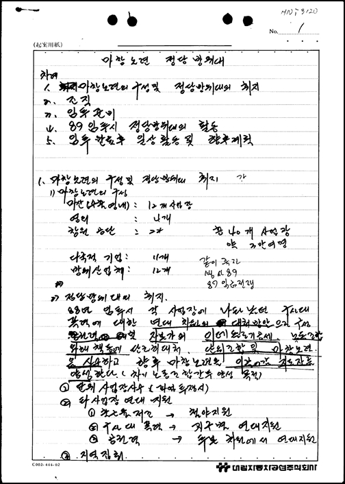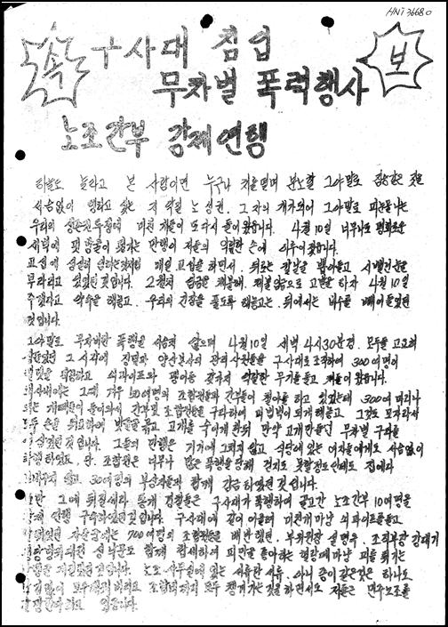 세신실업 구사대 침탈과 마창노련 정당방위대(정방대) 이영기(노동자역사 한내 자료국장)  <세신실업노조 속보. 1989년 4월 10일> 1989년 2월 2일 ‘마산창원지역 노동법개정 및 임금인상투쟁본부(마창공투본) 발대식’(1만 2천여 명 참가)과 3월 24일 임투전진대회(2만 2천여 명 참가)를 성공적으로 치르면서 마창지역의 1989년 공동임투의 기운은 높아져 갔다. 마창공투본에 참여한 노조 중 38개 노조(69%)가 3월 말~4월 초 사이에 집중적으로 교섭을 시작할 정도로 공동연대투쟁의 열기가 뜨거웠다. 마창노련 소속 사업장인 세신실업은 1989년 2월부터 파업농성 중이었다. 최저생계비와 동종업계 임금수준에 기준한 노조의 임금인상안과 교섭 요구에 대해, 사측은 무시와 김빼기로 일관했다. 1월 쟁의발생신고 후 2월 15일부터 돌입한 노조의 부분파업은 사측이 3일만에 직장폐쇄로 맞서는 바람에 자연스레 전면파업, 농성투쟁으로 바뀌었다. 한 달 이상 파업농성 중이던 1989년 4월 10일 새벽 4시 30분, 300여 명의 구사대가 농성장을 침탈했다. 세신실업 노조의 당일 속보는 이렇게 전하고 있다. “모두들 고요히 잠들었던 그 시각에 정밀과 양산본사의 관리사원들을 구사대로 조직하여 300여 명이 헬멧을 착용하고 쇠파이프와 괭이 등 갖가지 악랄한 무기를 들고 쳐들어 왔습니다. .....중략......조합원들은 너무나 많은 폭행을 당해 걷지도 못할 정도인데도 집에도 보내주지 않고 30여 명의 부상자들과 함께 감금하였던 것입니다. 또한 그에 뒤질세라 똥개 경찰들은 구사대가 폭행하여 끌고 간 노조간부 10여 명을 강제 연행 구속하였던 것입니다.” ...................................................................1989년 4월 10일 세신실업노조 속보 중 세신실업노조 속보는 이후 상황에 대해 “오전 9시 30분 경 마창 노동형제들이 하나가 되어 어려운 싸움을 하여 구사대를 박살내고” 투쟁 현장을 되찾았다고 했다. 힘이 되어 준 마창 노동형제들에게 진심으로 감사하다며 절대로 질 수 없다는 각오로 결사 투쟁의 결의를 세우고 있다. 그러나 속보나 노조의 다른 기록에서는 조금 더 자세한 것을 확인할 수 없었다, 그러다 마창노련 정당방위대(정방대)의 1989년 임투시기 활동 및 평가 기록(1989년 6월 작성된 것으로 추정)에서 조금 더 생생한 내용을 찾을 수 있었다.  <마창노련 정방대 활동기록, 1989년 6월 추정> 이 기록에 의하면 그날 오전 8시 마창공투본과 마창노련 정방대에 비상이 걸렸다. 09시에 삼미, 대원, 금성사노조 조합원 500여 명이 출근길에 바로 집결했고, 09시 30분 타코마, 통일, 대림노조 정방대 200여 명이 세신실업에 도착했다. 작전수립 후 10시에 작전이 개시되어 5분만에 정문을 돌파하고 구사대 30명을 “체포”하고 30분만에 상황을 종료시켰다. 이후 전경들이 출동한 상황에서 정방대원들을 제외한 일반 조합원들은 퇴각 조치하고 정방대원들은 전경들과 대치했다. 저녁 7시 30분 포로로 잡고 있던 구사대원들과의 교환조건으로 강제연행 되었던 노조간부들이 모두 석방되었다. 이 기록에는 마창노련 정방대의 결성 취지와 조직구성, 1989년 임투시기의 활동과 평가도 담겨 있다. 1988년 임투를 거치며 각 노조별로 노조 및 투쟁 사수를 위한 정방대가 결성되었다. 1988년 7월 마창노련 의장 및 구속동지 석방투쟁에 타코마노조의 정방대가 선도적 역할을 하면서 노조별 정방대 사이의 연대의 필요성을 재인식하게 되었다. 1988년 말, 1989년 임투 준비를 시작하면서 마창노련 정방대의 조직을 본격적으로 논의하기 시작했고 3월 24일 임투전진대회에서 선봉대 발대식을 가졌다. 임투전진대회 사수투쟁, 3월 30일, 4월 7일 현대중공업 공권력 개입 항의 투쟁, 4월 9일 창원대 연합 집회 사수투쟁, 부산산기노조 지원 투쟁, 4월 10일 세신실업노조 구사대 격퇴, 4월 말~5월 통일중공업노조, 금성사노조 지원 투쟁, 4월 26일 마창노련 이흥석 의장 석방투쟁, 5월 전국노동자대회(노동절) 투쟁 등 마창노련 정방대는 1989년 공동임투 시기 연대투쟁의 제일 앞선에 있었다. 그 중에서도 세신실업 구사대 격퇴 투쟁은 마창지역을 ‘전국 노동운동의 성지’, 마창 노동자들을 ‘불패의 노동자 군단’으로 불리게 한 투쟁으로, 지역연대투쟁의 위력을 유감없이 발휘하여 승리한 상징적인 투쟁이다. 참고자료 - 김하경, 『내사랑 마창노련』상, 갈무리, 1999 - 전노협백서 발간위원회, 노동운동역사자료실, 『이제는 하나다! 전노협』 전노협백서2권, 논장, 2003 |