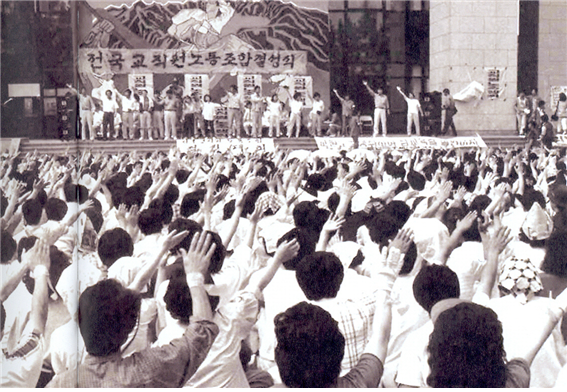 *1989년 5월 28일 연세대 도서관 광장에서 열린 전국교직원노동조합 결성식 장면 .
