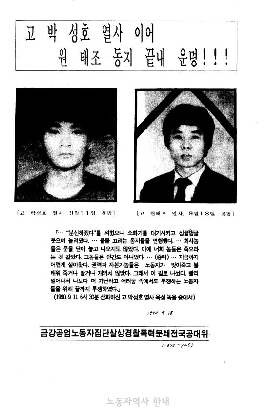 양규헌의 ‘내가 살아온 길’ ⑫ 원태조 박성호 열사 투쟁 파업현장 공권력 침탈에 분신으로 항거 1990년 1월 전노협이 건설되고 난 뒤 민주노조에 대한 지배세력의 공격은 더욱 강화됐다. 1990년 8월 말, 안산지역에 있는 금강공업이 파업과 함께 노동조합을 만드는 과정에 공권력이 침탈했다. 공권력을 막아내기 위해 원태조, 박성호, 정만교 동지가 휘발유를 온몸에 뿌리고 저항하던 중 경찰이 다가와 라이터를 뺏으려고 하는 사이 “펑” 하는 폭음과 함께 두 동지가 쓰러졌다. 이 사건은 경찰의 무리한 진압이 빚은 ‘미필적 고의’였고, 원태조, 박성호 동지는 70% 이상의 화상으로 중태에 빠졌다. 지역에 공투위가 꾸려졌다. 경기노련 의장이 구속돼 있었으므로 사무처장인 내가 공동대표를 맡았다. 가두 투쟁과 병원 사수투쟁이 매일 진행됐다. 공투위 동지들은 잠잘 시간이 없을 정도로 정신없이 전술을 논의하고 평가를 해가면서 지역의 결의를 모아 투쟁의 파고를 높여나갔다. 분신 일주일 째 원태조, 박성호 동지가 위독해지자 한강성심병원으로 거점을 옮겼다. 투쟁본부는 거점을 두 곳으로 분산했다. 1990년 여름 장마는 지루했고 연일 퍼붓는 폭우는 세상을 집어삼킬 듯했다. 영등포역에서 영등포시장을 거쳐 한강성심병원 가는 길은 온통 비에 잠겨있었다. 영등포시장을 지나는 길은 보이지 않고 온갖 오물들이 호수를 만들고 있었다. 영등포시장은 물이 가슴까지 차올랐고 헤엄치듯 한강성심병원을 향해 물길을 헤집고 나아갔다. 온몸을 둘둘 감은 붕대 속에 갇힌 동지들 몸은 퉁퉁 부어있었고, 치료시간이 되면 비명이 병원을 찢을 듯했다. 화상 치료는 진물이 말라붙은 딱지를 매일 깎아내고 그 위에 알코올로 소독을 하는데, 그 통증은 의식이 가물거리는 화상 환자에게도 참을 수 없는 고통으로 전해진다고 한다.