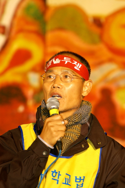 나에게 전교조위원장(03~04)으로 2년은 너무 바쁜 시기였다. 교육개방 반대와 정보인권 사수(네이스 폐기)농성으로 시작해 사립학교법 개정 농성으로 임기를 마쳤다. 국가인권위가 네이스 3개 영역을 ‘인권침해’로 규정하고 교육부도 전교조와의 합의를 지키겠다고 약속했으나 잉크도 마르기전에 합의를 어겼기 때문에 연가투쟁이 강행되었고 이로 인해 나는 두 번째 감옥살이를 하게 되었다. 단식, 농성, 연행, 구속과 같은 일이 일어났지만 결코 힘들지는 않았다. 그러나 아쉬운 점은 민중진영의 공교육 개편안으로 입시제도 개혁과 대학평준화를 마련했지만 전교조의 사업으로 지속되지 못해 안타까웠다.