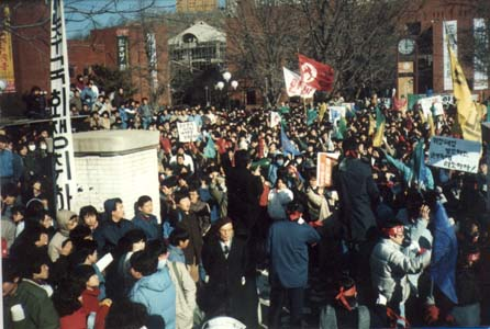 1988년 2월 동숭동 대학로에서 열린 (가칭)민중의 당 창당 발기인대회 모습 대선 국면부터 시작된 노동자해방동맹 내부의 논쟁은 결국 봉합할 수 없는 당파성의 차이로 귀결되었다. 민주연립정부를 주장하는 조직 중앙은 다수파가 되었고, 민중 집권을 주장하는 편집 중앙은 소수파가 되었다. 이후 ‘민주연합전선’이냐 ‘민중통일전선’이냐의 논쟁으로 확산되기도 했다. 결국 노해동 소수파는 1988년 4월 1일 ‘분리선언서’를 내고 독자 대오를 꾸리기 시작했다. 약 1년 반 동안의 모색 끝에 1989년 11월 12일, 서울대에서 열린 전국노동자대회에서 노동계급 전위조직 ‘남한사회주의노동자동맹’(약칭 사노맹) 출범을 선언했다. 지역 경찰에 비상이 걸린 모양이다. 몇 명씩 회사에 들어와서 내 신상명세서를 뒤지는 바람에 회사가 발칵 뒤집혔다. 회사에서 긴밀히 얘기 좀 하자 해서 만났는데 나를 위해서 하는 말이라며, “노동운동까지는 이해하겠는데 무슨 혁명을 하냐”며 “제발 회사와 자신을 위해서 그런 활동은 안하면 안 되겠냐”는 것이다. “나 자신을 위해 하는 활동이니 상관하지 마시오.”라며 나왔다. 그 후부터 회사 내부에서 빨갱이 얘기가 나돌았고, 축구선수들을 중심으로 노동조합 반대세력이 생기기 시작했다. 평소에 내가 아꼈던 고등학교 후배조차도 반대편에 서 있었다. ‘빨갱이’라는 말의 위력은 인간관계, 의리라는 것조차 파괴하는 것은 물론이고 노동자를 분열시키는데 최고의 명약이며, 노동조합 내부를 교란하는데 결정적인 수단이자 언어였다. 총선 이후 민중후보진영 분열·잠적 지역 총선에서 노동자 후보 안기석은 총선투쟁의 성과를 모아내지 못했다. 우선 지역 활동가들이나 단체에서도 ‘민중의 당’에 우호적이지 않았고 비판적 지지세가 강했으나 그런 지점을 뚫어내기에는 역부족이었다. 나아가 민주노조 내부에서도 민중후보 지지를 조심스러워하는 분위기였다. 선거가 끝나고 후보로 나섰던 안기석은 신아화학에서 해고돼 출근투쟁에 나섰다. 그런데 민중후보 진영에 결합해서 날마다 노동자·민중의 정치세력화를 외치던 동지들이 없어졌다. 나중에 알게 된 사실이지만 노해동 이후 소수, 다수로 갈라져 소수는 ND, 다수는 NL로 분리되면서 소수가 모두 수면 아래로 잠적했는데 안양지역 노해동은 대부분이 소수로 분리되어 지하활동으로 전환하면서 사노맹을 만들었다. 1988년 어느 날, 노해동에서 활동하며 총선에 집중했던 동지 몇 명이 찾아왔다. 안양에 ‘노동자대학’을 만드는데 같이 하자는 얘기였다. 나는 분노가 치밀어 올랐다. “노동해방을 주장하는 사람들이 선거투쟁에 함께 했던 동지가 해고투쟁을 할 때 모두 잠적해버리고, 선거투쟁 평가는커녕 책임성도 없으면서 무슨 낯짝으로 노동자대학을 만드나? 절대 안 된다”고 했다. 만약에 안양지역에 노동자대학을 세우면 내가 불 싸질러버린다고 했다. 몇 번 더 그 동지들이 와서 의사 타진을 했지만 내 생각은 변함이 없었고 그 친구들은 울면서 돌아갔다. 그 후에 그들은 인천에 노동자대학을 세웠다. 노동자대학 설립 후에 그 동지들을 몇 번 볼 기회가 있었는데 내 표현이 너무 과도했다고 생각했지만 미안하다고 하지는 못했다. 싸우고 또 싸워야 했던 5.18 전야제 민주노조 활동가들은 80년대 초반에 정상적인 활동을 할 수가 없었다. 정화위원회가 공장마다 설치되고 노동조합에 대한 감시가 워낙 심했기 때문이다. 주로 외신기자가 짜깁기한 (허접하기 짝이 없는) 광주민중항쟁 비디오테이프를 품에 넣고 믿을 수 있는 조합원들과 함께 자취방에 들어가 담요로 문을 가린 다음 광주의 상황을 흔들리는 영상으로 확인했다. 그런데 10명이 비디오를 보면 2명 정도는 광주항쟁에서 일어났던 폭력적 진압을 믿을 수 없다고 하는 바람에 장시간 토론을 하기도 했다. 그나마 광주가 고향인 동지들이 어설프게라도 증언을 해주었기에 사실로 이해하게 되는 경우가 많았다. 5.18 광주민중항쟁 전야제에 대중적으로 참여한 것은 1987년 이후로 기억된다. 대중적으로 참여했다고 해서 합법성이 보장되었다는 뜻은 아니다. 광주 5.18 참배를 하러 가면 망월동뿐만 아니라 광주역과 시외버스터미널에서부터 외부인들을 막아섰다. 노동자들은 지역별로 열차를 타고 광주로 향했다. 광주역 등은 경찰들이 쫙 깔려 내리는 노동자들을 연행하는 분위기였다. 우리는 광주역과 송정역 사이 역이 아닌 곳에 열차를 강제로 세우고 내려서 걷기도 뛰기도 하면서 대학교로 진입해야 했다.  사진: https://news.v.daum.net/v/20200621185100465 민주노조진영은 5.18 광주민중항쟁 전야제부터 투쟁에 참여하는데, 밤늦도록 경찰들과 밀고 밀리는 공방을 했다. 투쟁이 소강 국면에 접어들면 새벽녘에 조별로 토론하며 새벽을 밝혔다. 어느 해는 전남대에 〈파업전야〉 상영을 막으려고 진입하는 공권력에 맞서 투쟁으로 영화를 사수해야 했다. 어느 해에는 조선대에 모인 노동자들을 향해 언덕 아래서 밀고 올라오는 공권력에 맞서 밤늦은 시간까지 돌과 화염병을 던지며 싸워야 했다. * 민중의 당 : 1988년 2월 발기인 279명 등 2천여 명이 창당발기인대회를