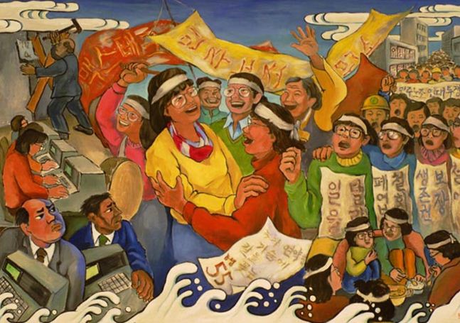 맥스테크 여성동자들의 투쟁은 80년대 노동운동사에서 대표적인 투쟁으로 기억되고 있다. 그림패 ‘둥지’의 공동창작 걸개그림 <맥스테크 민주노조>로도 유명하다. 밑그림을 여성주의 화가인 김인순 님이 그렸는데 당시 노동문화예술의 대표적 작품이다. (1998/180*125/천에 아크릴_진보넷 블러그에서 가져옴)