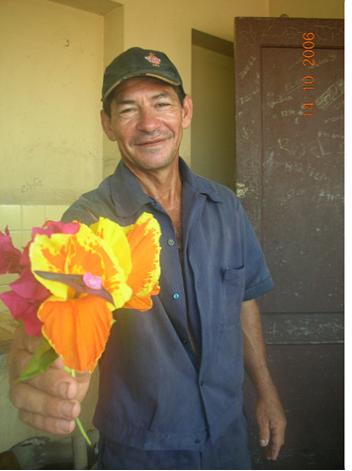 사진 : [꽃을 건네는 로베르토, 저자가 직접 찍었다]“너무 일을 많이 해서 모양이 바뀌어버린 손. 그 손의 주인은 길가 나무와 꽃들을 보살피고 키우는 일을 하는 노동자, 로베르토다. 금방 사라져버려 갔나 보다 했는데 한 손에 한 움큼 꽃을 들고 와서는 내게 내민다.”
