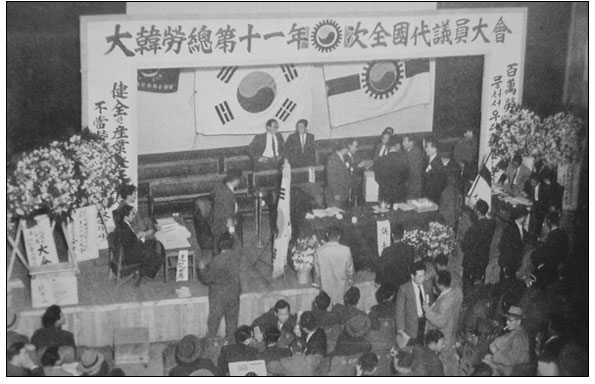 미군정과 새로운 통치세력은 합법적 제도권력을 독과점화하고, 그 힘으로 이미 존재하고 있었던 노동자들의 대표인 조선노동조합전국평의회를 부정하면서 노동자들의 새로운 제도권력을 반공우익세력들로 채웠다. 대한노총은 1946년 3월 10일 결성하되었다. 대한노총은 노동조합 대표가 아니라 깡패들과 반공 우익 청년단체에 소속되어 있는 회원들을 중심으로 15개 직장 45명이 참석한 가운데 결성대회를 개최하였고, 1947년에 이르러서는 조선노동조합전국평의회가 주도하는 총파업의 파괴와 이승만의 정치적 동원부대 역할을 충견처럼 수행하였고, 또한 대한노총 지도부들의 정치적 출세라는 정치권력의 대가로 이어졌다. 1948년 제헌의회에서는 대한노총 위원장 전진한, 제2대 국회에서는 대한노총 전감찰위원장 조광섭, 대한노총 경북연맹위원장 조경규 등이 국회의원으로 당선되어 권력카르텔의 구조에 편입하였다.