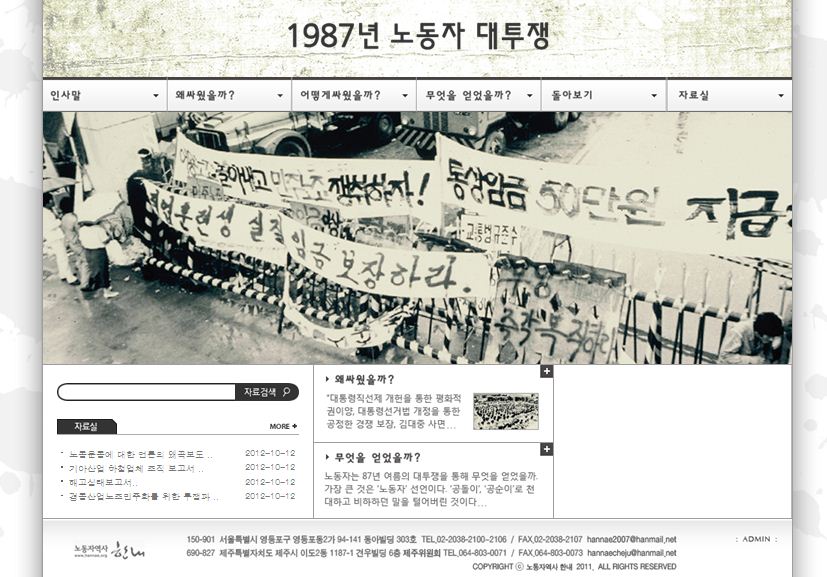 한내에서 1987년 노동자대투쟁 25주년을 맞아 그동안 수집, 전산화한 자료들을 사이버사료관을 통해 제공하게 되었습니다.