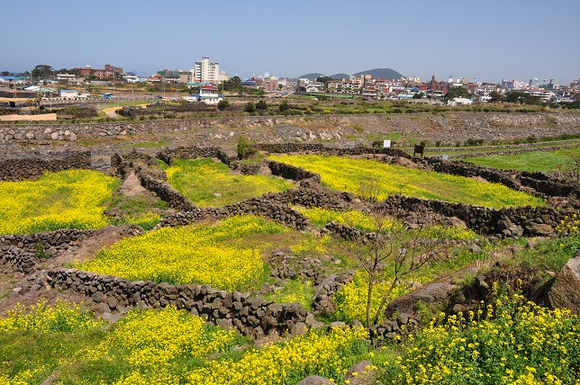 잃어버린 마을 곤을동. 돌로 싸은 집터가 그대로 보인다. 시에서 유채꽃을 심어놨다고 한다.
