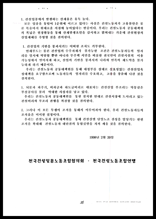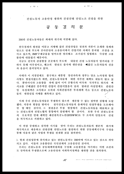 건설노동자 고용안정 쟁취와 건설산별 단일노조 건설을 위한 공동 결의문 1998년 2월 건설노련, 전일노협 공동결의문 - 이영기(노동자역사 한내)