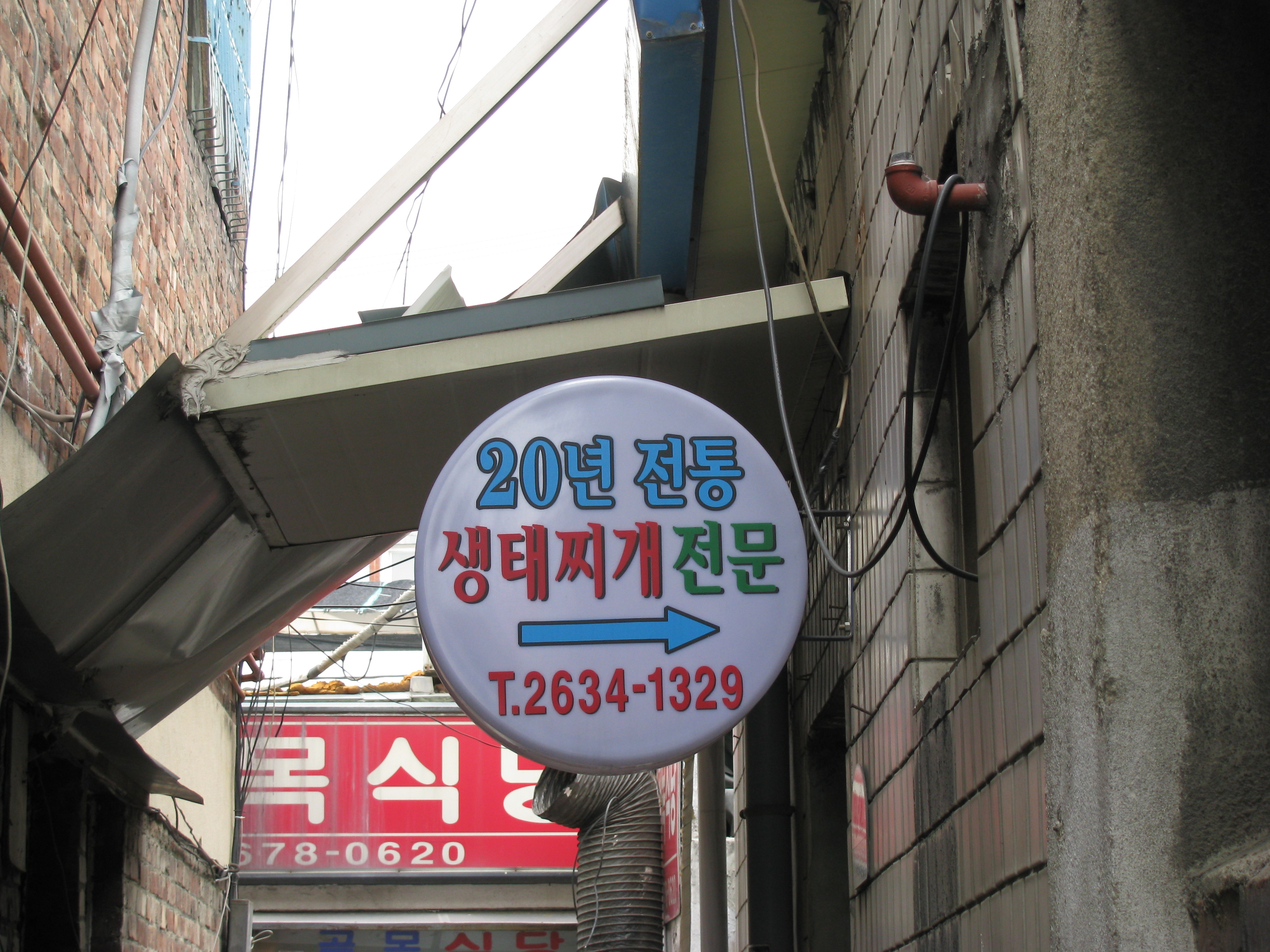 회원들과 함께 하고픈 내 단골집은 바로 “20년 전통 생태찌개 전문점”이다. 영등포 연흥극장 건너편 인도를 따라 영등포시장쪽으로 가다보면 시장 입구와 나란히 자리잡은 복합 쇼핑몰이 보이고, 그 옆으로 공구상가로 이어지는 작은 골목이 있다. 동굴같은 시장 골목을 따라 20m 정도를 들어가면 사람 하나 겨우 다닐 허름하고 작은 골목 왼편에 이 맛집이 자리하고 있다. 허름하고 칙칙한 골목에는 “20년 전통”이라는 간판만이 이 곳이 식당임을 알게 해 준다.