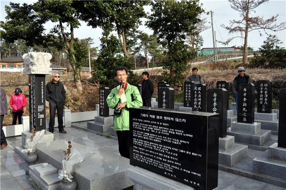 <이덕구묘역을 설명해주는 전우홍 한내 제주위원회 전 부위원장. 이날 바람이 세차게 불고 쌀쌀했다.>