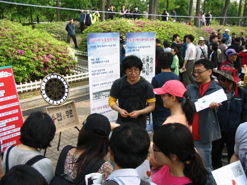 다트 던지기와 문제풀이를 통해 셰계 노동절의 유래와 한국에서의 노동절의 역사를 알아가는 이번 행사에 말 그대로 남.녀.노.소 많은 분들이 참여해 주셨고 행사에 참여해 주신 분들에게는 예쁜 한내 기자수첩을 기념품으로 나누어 드렸습니다. 다트판 아래에 분명히 119주년 노동절 기념이라고 (나름대로) 크게 써 놓았음에도 소신 있게 120주년을 외쳐주시는 노동자분들도 있었고, 다트 던지기가 쑥스러운 아버지 노동자, 유창한 한국말을 구사하며 문제를 풀던 어느 이주 노동자, 정답이 바로 옆 전시물에 있는데도 오답을 걱정하던 어느 학생 예비 노동자, 엄마랑 누나 따라 다트 던지기를 계속 조르던 어느 꼬마까지 즐겁고 의미 있는 시간을 보냈습니다.