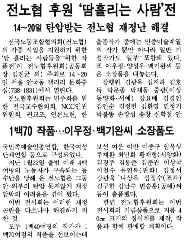 1990913일 한겨레신문에 이런 기사가 났다. “전노협의 각종 사업을 지원하기 위한 '땀 흘리는 사람들을 위한 작품전'이 전노협후원회(공동회장 김진균 외) 주최로 서울 [19909]14~20일 서울 안국동 갤러리 문화중심에서 열린다. 전노협후원회는 민주화를 위한 전국교수협의회, NCC인권위원회, 전교조, 언론노련, 한국민예총, 한국여성단체현합 등으로 구성되었다. ......한편 전노협후원회는 이번 전시회의 기념상품으로 지름 40cm 크기의 징시계를 제작, 작품과 함께 판매할 계획이다.”