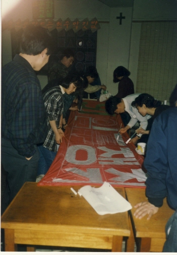 1990년대 초까지는 대부분의 사업장에서 현수막을 직접 만들었다. 구호를 적고 밑글씨를 쓴 다음 칠했다. 임투를 앞두고 지역에서 연 선전선동교육의 마무리는 참가자들이 조를 짜 실습을 했다. 대자보, 현수막 등을 손수 만들어 현장으로 가지고 갔다.