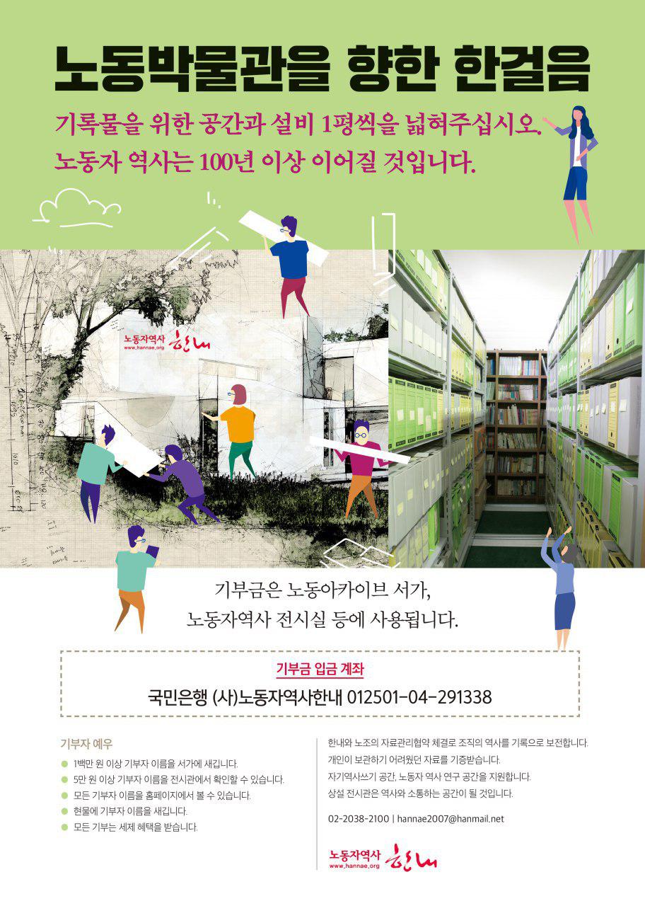기부액 169,735,000원 (2019년 4월 10일 18시 현재) 기부금 입금 계좌 : 국민은행 사)노동자역사한내 012501-04-291338 <기부해주신 모든 분들께 감사드립니다> - 2019년 1월1일~4월 10일 18시까지 기부해주신 분들입니다. 강한규 강형구 권승복 금지연 김병구 김성광 김성희 김영환 김윤호 김은환 김정한 김종백 김지안 김지인 김한 주 나경원 노향균 민병욱 박성인 박준선 백운선 사부작 손도연 손수연 손자연 손하연 손형우 신원철 안그라미 안수민 안정희 안종호 안해민 오세일 우영욱 유현경 윤호숙 이동진 이만호 이민선 이선희 이승훈 이영기 이영주 이우하 이은재 이재현 이황미 장인하 전병영 정경원최영도 정규일이향춘 정용재이경미 조귀제 최도은 최미진 최원자 하종강 하종문 건설노조경기중서부건설지부 공공운수노조광주전남지부 금속노조대전충북지부 금속노조현대자동차지부 노동자의책 시대의창 전국공무원노조강릉시지부 조계종노동위원회 페미니스트북카페펨 노동자역사한내제주위원회 현대중공업노조하청지회 - 2018년 12월 31일까지 기부해주신 분들입니다. 강주리 이수호 JIANG-ZHEZ 강동진 강석도 강세구 강한규 강현진 강화연 강희원 고경섭 고계형 고대언 故미노드목탄 故이정원 공영옥 공현 곽칠권 곽형덕 권미정 권수정김기식 권순미 권용선 권용희 권은영 김갑수 김걸 김경일 김금희 김기정 김기헌 김남희 김대호 김대훈 김도형 김동구 김동선 김동성 김명철 김미득 김미애 김미영 김미정 김미화 김보현 김봉길 김상진 김석 김선정 김선태 김선혁 김성민 김성봉 김수열 김영선 김영수 김영숙 김영준 김용관 김용익 김용화 김원경 김원중 김유승 김육훈 김은선 김은주 김은주이지연 김정수 김정숙 김정호 김종인 김주헌 김준범 김준희 김진순 김춘배 김태영 김태희 김하경 김하규 김하늬 김학년 김한익 김한주 김현경 김현옥 김현우 김현종 김혜경 김혜영김장환 김호 김호규 김호정 김호중 김화경 김효문 김효은 김희준 나영선 나윤희 남선우 남선진 남성국 남양식 노상규 노성철 노원호 노윤아 노중기 단병호 류동연 류석진 류신애 문찬일 민경민 민병래 박건 박귀천 박근태 박기수 박동범 박문진 박민웅 박병선이종희 박석삼 박선봉 박선영 박성락 박성열 박시완 박시윤 박엄선 박영길 박원우 박유리 박은정 박인서박세연 박장준 박재범 박재범 박종연 박준성 박준현 박지영 박충종 박태국 박하순 박향주 박호준 배영진 배은희 백동현 백연재 백운광 변은숙 서동현 서미경 서상빈 서영남 서원선 서인형 서혜경 석치순 선지현 설문원 성명애 성혜경 손소희 손정원 송민영 송시우 송영숙 송제숙 송찬섭 신동호 신수정 신시연 신우현 신인령 신장근 신재걸 신창화 신천섭 신헌창 신희원 심우청 안명희 안설희 안설희 안중철 안태정 양건모 양규헌 양돌규 양동규 양선배 양솔규 양지호 양혜규 엄길용 엄진령 염동선 염춘필 예희정 오영환 오정민 오주형 우선아 우인희 원영만 원종관 유기수 유영조 유용문 유이지운 유재경 유형근 윤수근 윤애림 윤정향 윤지현 윤충로 윤해동 음광석 이건명 이건용 이규삼 이김춘택 이남신 이미경 이미나 이미정 이민숙 이민정 이상언 이상호 이상호 이상훈 이상훈 이선인 이성영 이성희 이수민 이승근 이승호 이영기 이영호 이용기 이운재 이원용 이은정이기일 이은주 이은주 이임하 이재성 이재숙 이정석 이정신 이정필 이정희 이조훈 이종회 이주철 이주환 이준임 이지수 이창근 이창언 이철의 이철환 이치열 이태식 이태환 이향희 이현 이현혜 이호계 이호동 이훈구 이흥우 임광순 임두혁 임선화 임선화 임송자 임영일 임진아 임진희 임혜숙 장광진 장미현 장시영 장은하 장인선 장제현 장혜경 전누리 전은숙 전장호 전종현 전호석 정미화 정민용 정민주 정상희 정승균 정시영 정연용 정연희 정영훈 정원현 정은정 정인열 정재은 정진희 정창훈 정태화 제용순 조경배 조경석 조남덕 조보연 조연희 조영삼 조이화 조지영 조창묵 조한소 조혜정 조희주 주미순 주윤영 주진우 주형우 지인웅 진숙경 진원석 천아름이민재 천정환 최갑수 최규진 최대현 최명숙 최미정 최보민 최상구 최성용 최영길 최오수 최윤정 최윤정 최윤정 최인정 최장진 최재성 최재희 최종진 최진수 최혜민 태기철 한겸택 한규은 한병준 한성웅 한정은 한진 한진용 한태호 한혁 허영구 허은 허은숙 현광훈 현희숙 홍상아 홍원기 홍은성 홍현진 황규만 황길영 황선희 황하일 (주)바로텍 KT노동조합본사지방본부 KT민주동지회 LGU+비정규직지부 공공운수노동조합 공 공공운수노조부산교통공단노동조합 공공운수노조서울교통공사노동조합 공공운수노조서울지부 공공운수노조서울지부고려대분회 공공운수노조서울지부덕성여대분회 공운수노조서울지부연세대분회 공공운수노조서울지부이화여대분회 공공운수노조서울지부홍익대분회 공공운수노조의료연대본부 공공운수노조전국교육공무직본부 공공운수노조전북평등지부 공공운수노조택시지부 공공운수노조한국가스공사지부 공공운수노조한국지역난방공사노동조합 구로동맹파업동지회 구속노동자후원회 금속노조대전충북지부 금속노조대한
