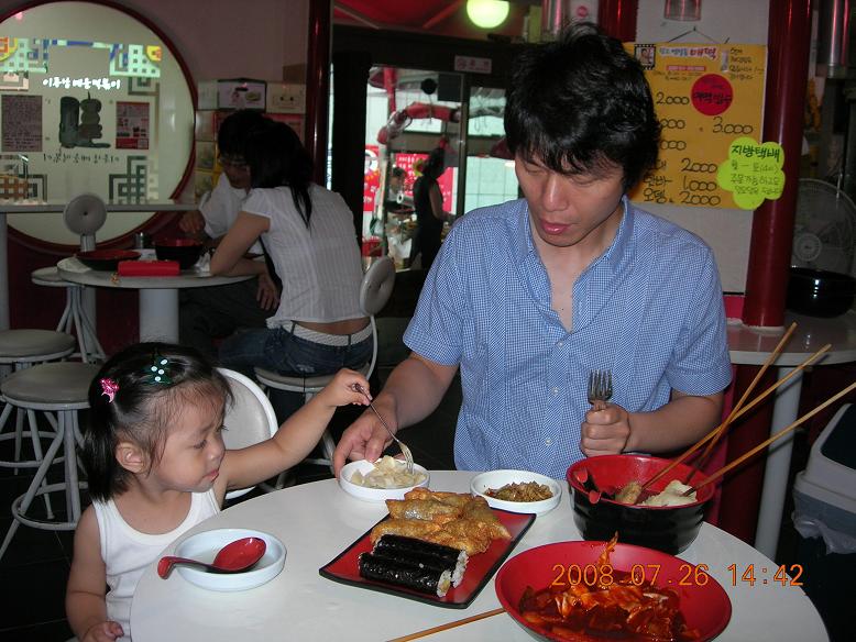 그런데 이게 어찌된 일인가? 조건반사의 동물적 본능을 몸소 느낀 건 그로부터 한참이 지난 어느 날이었다. 범일동을 지나가다 시장골목에서 매떡 포장마차를 발견하고는 저절로 침이 고이고 시선과 함께 목이 돌아가고, 끝내는 두 다리가 어느새 그 쪽으로 향하는게 아닌가. 그렇게 이루어진 두 번째 만남에서는 참고 참아가며 매떡 하나를 다 먹을 수 있었고, 우리 인연은 눈물과 콧물과 땀방울이 어울어져 점점 끈끈해졌으며 이런 만남이 거듭될수록 먹을 수 있는 떡볶이 양도 비례해서 늘어갔다. 단순히 매운 고춧가루 맛이 아니라 10가지가 넘는 재료로 믹스된 특제소스의 깊은 매운맛에 점점 중독되어 간 것이다.그리하여 매운 떡볶이집은 연애 시절 빼놓을 수 없는 데이트 코스가 되었고 지금은 딸아이와 셋이서 자주 찾고 있다(태교 때문인지 딸아이가 이집 어묵을 무척 좋아한다. 단 매떡은 아직 섭취불가!)