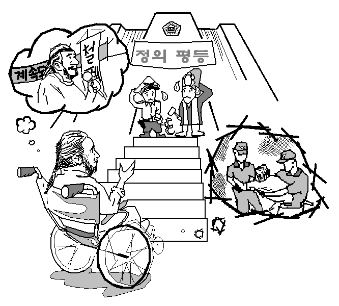 나는 부끄럽게도 장애인 문제를 잘 모른다. 민주노총 법률원에 있다는 이유로 우연히 그의 형사재판을 처음 맡게 되었지만, 그의 재판을 맡고서야 법원에 민원인들이 이용할 수 있는 법정 출석용 엘리베이터가 없다는 사실을 알았다. 그는 한참을 싸워서야 계단에 요식으로 설치된 위험한 리프트 대신 판사용 엘리베이터를 타고 법정으로 올라 왔다(지금은 서울중앙지방법원에도 엘리베이터가 설치되어 있다).