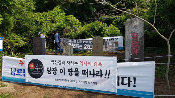 4.3 항쟁은 현재진행형이다. 추모하려는 자와 단죄하려는 자 - 박진경 추도비 김미화 (노동자역사 한내 회원) 코로나로 중단되었던 한내 제주 4.3항쟁 답사는 올해 아홉 번째로 6월 9~11일 2박 3일 일정으로 진행됐다. 이번 역사 기행은 무장유격대의 발자취 특히 무장유격대와 토벌대 사이 전투가 가장 격렬하게 벌어졌던 장소를 찾아보는 코스였다. 관음사 일대 유격대와 토벌대 주둔지, 일제가 파놓은 동굴, 유격대가 가장 큰 승리를 거둔 산내물 전투가 벌어진 노루오름과 제주항 앞 주정공장 등을 답사했다. 무장유격대의 발자취를 좇아가던 중 우리는 4.3항쟁이 여전히 현재진행형임을 깨닫게 되었다. 그것은 박진경 추도비를 방문했을 때였다. 관음사에서 멀지 않은 한울공원에는 11연대 연대장으로 학살을 주도한 박진경 추도비가 있다. 이 추도비는 제주시 충혼묘지 입구에서 2021년 한울공원으로 이전됐다. 충혼묘지는 제주 4.3항쟁과 한국전쟁을 전후한 시기에 희생된 군 전사자와 경찰 전사자들의 유해가 안장된 공원묘지다. 제주도민들은 학살자를 추모할 수 없다며 오래전부터 철거를 요구했다. 4.3항쟁 진상규명이 진척됨에 따른 당연한 결과였다. 문제가 불거진 것은 제주 충혼묘지가 국립제주호국원으로 격상, 확장되면서 국가보훈처가 이 추도비 인수를 거부하자 제주도보훈청이 나서서 월남전 참전군인 위령사업을 목적으로 제주시로부터 이관받은 한울공원으로 이전했다. 박진경 추도비는 월남전과는 전혀 관련이 없다. 그럼에도 그를 추모하는 세력은 어떻게든 추도비를 존속시켜야 했다. 2022년 3월 10일 한내 제주위원회를 비롯한 제주 4.3기념사업위원회 등 제주도 내 16개 단체는 박진경 추도비에 역사의 단죄를 의미하는 철창을 설치하고 역사의 감옥이라 명명했다. 그러자 공원부지 관할권을 가진 제주도보훈청이 철거를 요청하고 5월 20일 철거 행정대집행을 통해 철창을 제거하기에 이르렀다. 답사 참가자들이 박진경 추도비를 찾아갔을 때는 “4.3사건 지서 12개 습격은 남로당 공산주의자들의 폭동이다” “남로당 지령 하에 암살된 박진경은 자유대한민국 호국영령이다” 현수막이 제주 4.3사건 경찰유족회와 박진경 유족 명의로 추도비를 둘러싸고 있었다. 박진경은 일제강점기 일본군 소대장으로 제주도에 근무했다. 미군정은 제주도 내 일본군 요새를 잘 아는 박진경에게 강력한 토벌을 전개하라고 임명했다. 박진경은 1948년 5월 6일 9연대가 11연대로 바뀌면서 초대 11연대장으로 제주도에 부임했다. 그는 부임 초기부터 김익렬 연대장과는 달리 강경 진압 작전을 펼쳐 6주 동안 4,000여 명을 체포하고 500명을 구속했다. 무차별 진압을 공로로 미군정은 그를 대령으로 특진시켰다. 그러나 “제주도민 30만 명을 희생시켜도 좋다”는 박진경의 작전방침에 불만을 품은 부하들에 의해 6월 18일 박진경은 암살됐다. 제주 4.3 항쟁을 강경 진압했던 박진경을 추모한다는 것은 4.3 항쟁의 성격과 정체성이 맞닿아 있는 문제다. 역사 기행은 단지 과거를 훑고 지나가는 일이 아니라 현재의 시각에서 역사를 해석하는 문제가 남아있음을 알게 되었다. 박진경을 추모하고 싶은 세력과 그를 단죄하고 역사 속에서 평가해내려는 세력 사이에 4.3은 여전히 계속되고 있다. 역사를 기억하고 평가하고 기록하는 일은 과거의 사건만을 대상으로 하지 않는다. 역사는 과거에서 현재를 통해 미래를 이어가야 하는 과제다. 한내 제주위원회는 현수막을 준비해왔다. 답사 참가자들은 현수막을 겹쳐서 걸기 시작했다.