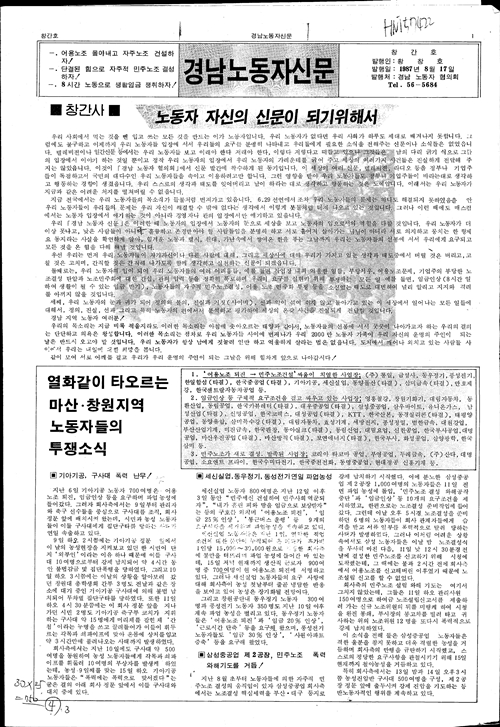 ‘경남노동자신문’이 전하는 마산, 창원 노동자들의 1987년 7, 8, 9월 이영기(노동자역사 한내 자료국장) “경남노동자신문”은 마산, 창원지역에서 경남지역노동자협의회(경노협)가 1987년 노동자대투쟁 기간 동안 발행했던 신문이다. 1987년 7월부터 10월까지 정규호와 속보를 각각 4차례씩 발행했다. 경노협은 1987년 7월 26일 경남지역 해고 노동자들을 중심으로 결성되었다. 그 동안의 노조활동과 투쟁 경험을 바탕으로 노조경험이 전무한 노동자들에게 노조설립, 노조활동에 대한 구체적인 활동방침과 절차에 대한 상담과 교육활동에 힘썼다. 마산창원지역의 노동자대투쟁 기간 내내 노조설립과 노조민주화투쟁을 보이지 않게 지원하며 주요한 역할을 수행했다. ‘경남노동자신문’은 대략 한 달 간격으로 발행되었다. 창간호(8월 17일)와 2호(9월 18일)에서는 어용노조에서 노조민주화를 이룬 사업장, 민주노조 신규 결성 사업장, 임금인상 등 구체적인 요구사항을 걸고 투쟁 중인 사업장들을 확인할 수 있다. 2호에 실린 만평은 ‘폭력’, ‘구사대’, ‘구속’ 대포알을 쏘아대는 사측과 공권력에 맞서 민주노조의 성벽위에서 ‘노동3권 보장하라’ 구호를 외치며 굳건히 투쟁하고 있는 노동자들을 그리고 있다. 3호(10월 18일)에는 통일중공업노조 위원장 구속 등 공세로 전환한 공권력의 노조탄압 소식과 그에 맞선 노동자들의 민주노조 사수, 구속노동자 석방 투쟁 소식들이 함께 실려 있다. 노동자들은 공장 앞마당, 잔디밭에 모여 파업농성에 돌입하고 ‘어용노조 물러가라’, ‘근로시간 단축’, ‘임금인상’의 요구조건이 담긴 구호를 외쳤다. 노동자들 스스로 노조결성 보고대회를 열고, 협상대표단의 보고와 함께 조합원 총회를 열고 열띤 토론이 벌였다. 함께 노가바를 가르치고 배우고, 규찰대를 조직해서 농성장의 규율을 잡고, 구사대의 폭력에 맞서 싸웠다. 사측은 어용노조설립신고서를 들고서 민주노조를 준비하는 노동자들과 달리기 시합을 했다. 노동자, 노조와의 대화 핑계를 늘어놓거나 무조건 파업부터 풀라 생떼를 부리는 자리였다. 농성장에 몰래 술을 들여보내 파업 분위기를 흐리려고 하거나, 공장 밖에서 노동자나 가족들을 몰래 찾아다니며 조합 탈퇴서나 각서에 서명을 강요하고 다녔다. 구사대를 앞세운 협박과 회유, 폭력이 일상이었다. 경찰들은 사측, 구사대의 폭력에는 뒷짐 지고 구경만 하면서 노동자들에게는 직격 최루탄을 쏘아댔다. 그렇게 1987년 7월, 8, 9월 노동자들은 노조탄압에 맞서 투쟁으로 어용노조들을 퇴진시키고, 새롭게 민주노조를 결성하고, 작업장의 민주화, 노동조건 개선 등 노동자들의 자주적인 요구를 쟁취해 나갔다.