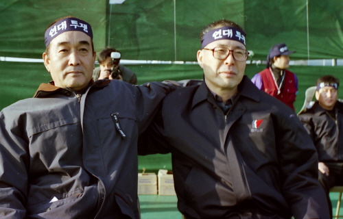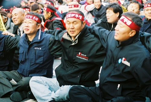 2. 2004년 11월 14일 광화문에서 열린 '2004 전국노동자대회'. 민주노총 이수호 위원장과 한국노총 이용득 위원장이 어깨를 걸고 투쟁가를 부르고 있다.(사진 : 이정원)