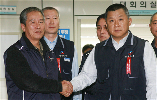 3. 2009년 10월 21일 연대방안 논의를 위한 양노총 위원장 회동을 마친 뒤 악수를 하고 있다.(사진: 민주노총)