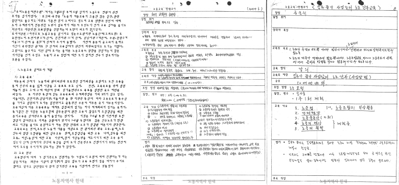 1988년 수도권 지역 노동교육 현황 조사(우리노동문제연구원) 이영기(노동자역사 한내 자료국장) 우리노동문제연구원(우리노연, 1988년 4월 창립)에서는 1988년 5월말~6월말, 수도권 지역의 노동교육 현황을 조사했다. 조사목적은 “노동자 대중교육이 그 동안 많은 질적, 양적 발전에도 불구하고 아직도 미흡한 점이 드러나고 있으며 교육 방향과 방법에 대해 보다 구체적이고 전문적인 노력이 필요하기 때문에 무엇보다 먼저 교육 실태를 올바로 파악하고 바람직한 교육방향을 정립하는 데 보탬이 되고자 함”이었다. 조사에는 서울 15곳, 인천 11곳, 부천 5곳, 수원과 안양 3곳 등 총 39개 노동단체(교회 포함)가 응했다. 현재 남아 있는 기록으로는 조사목적과 개요, 조사결과 등이 포함된 조사보고서 성격의 문서 일부와 27개 기관, 단체의 조사지(중복제외)를 확인할 수 있다. 조사 항목은 단체 설립 취지, 성격과 특성, 교육대상과 모집방법, 교육목표와 내용, 교육단체의 자체 평가 등으로 이루어져 있다. 조사가 수도권지역에 한정되었고 남아 있는 기록도 완전하지는 않지만 부분적이나마 1987년 노동자대투쟁 직후부터 1988년 6월 당시의 노동교육의 모습을 엿볼 수 있다.  우리노연의 분석에 따르면 당시 노조결성 준비과정 등에 대한 교육은 비중이 많이 줄었고 노조실무에 대한 교육이 많아졌다. 1987년 노동자대투쟁 이전과 비교하면 노조결성이 절대적으로 어려운 상황은 벗어났고 대투쟁 이후 급속히 늘어난 신규노조에서 노조를 올바로 운영해야 한다는 안팎의 인식과 요구가 반영된 것으로 보고 있다. 현재 남아 있는 조사지(27곳. 중복제외)로 보면 교회가 12곳, 노동단체(상담소 등)가 11곳으로 가장 많다. 미조직 노동자와 일반조합원의 경우는 노동자란 무엇인가. 인간다운 삶, 노조란 무엇인가, 노조실무, 임금과 임투, 단체교섭 등 노동자로서의 자각과 노조일반에 대한 이해를 높이는 교육이 주를 이뤘다. 노조간부 및 핵심(열성) 조합원을 대상으로 한 교육은 노동조합운동의 방향성, 정세분석, 노동운동가의 자세, 조직강화와 지역연대운동, 정치경제, 노동운동사, 사례연구, 임투, 단체교섭, 파업, 선동훈련 등이 중심내용이었다. 임투나 단협, 파업현장 등 노조의 요청에 의해 현장상황에 대응하는 교육에서는 임금과 임투, , 단체교섭, 지역연대운동, 사례연구 등이 선별 진행되었고 나머지 주제들은 일상활동을 공고히 하기 위한 것으로 분석하고 있다. ‘성교육’이 눈에 띄었는데 여성노동자들을 대상으로 여성운동의 초보의식 형성을 목적으로 진행했으며 노조 여성부 활동과도 관계된 것으로 보인다. 이러한 교육들은 주로 잔업이 없는 날을 택해(주로 수요일, 토요일) 2~3주 동안 3회~6회 정도 진행되었다. 상세하고 높은 수준의 교육이나 실제 훈련이 동반되는 교육은 1박2일의 숙박교육이 많이 활용되었다. 교육대상 모집은 노조나 활동가, 상담 받은 노동자들의 소개나 추천이 대부분이었고 공개모집은 비중이 낮았다. 교육방식은 강의와 질의응답, 토론이 주였고 노래와 율동배우기가 가미되었다. 비디오나 슬라이드 상영이 활용되기도 했다. 조사대상 단체들의 자체평가에서는 교육의 성과와 과제를 확인할 수 있다. 역시 사전에 준비가 많이 된 교육, 일방적인 교육보다는 다양한 프로그램, 풍부한 사례가 활용된 교육이 높은 호응과 성과를 가져왔음을 지적하고 있다. 같은 사업장, 타 사업장과의 공동교육 속에서 집단체험, 사례공유는 교육에 대한 이해와 연대의식을 높이는 성과를 가져왔다. 역량이 비슷한 노조, 동일업종 또는 동일 활동부서와 함께 하는 교육이 성과가 더 높다고 평가하고 있다. 문화프로그램은 높은 호응과 함께 기능의 측면에서 머물러서는 안된다는 한계, 노동자 자신의 문화에 대한 높은 요구를 충족시킬 수 있어야 한다는 과제가 함께 평가되고 있다. 또 중요한 평가지점은 교육이 일회성에 그치지 않고 그 성과가 현장으로 이어져야 한다는 점이었다. 이를 위해 교육 이후 후속프로그램과 노조의 일상 활동에서 안정적, 지속적인 교육의 필요성과 중요성을 말하고 있다. 더불어 노동교육단체의 교육역량 강화도 중요한 부분이지만 노조자체의 교육역량을 높여야 한다는 점도 노동조합, 노동운동 역량강화를 위해 중요한 교육방향, 과제로 보고 있었다. 또한 노동교육 단체 간의 협력체계 구축을 말한 평가도 있었다. 주관식 설문조사 같아 보이는 당시 조사의 특성 상 교안, 교육자료와 같이 구체적인 교육내용을 확인할 수는 없다. 극히 일부 ‘참고자료 참조’, ‘교안 참고’와 같은 말이 있는 것으로 보아 적은 숫자라도 교육관련 자료가 조사자에게 건네지기도 했던 것으로 보이나 남아 있는 기록에서는 찾을 수 없었다. 1987년 노동자대투쟁 이후 80년대 후반 노동교육, 조합원 교육의 구체적인 내용은 어떠했을까? 당시의 ‘교안 찾기’를 다음의 기록 찾기 과제로 남겨본다. |