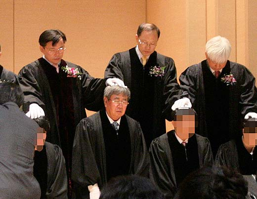 (사진2. 목사 안수를 받고 있는 이근안. 아랫줄 가운데 안경쓴 모습)