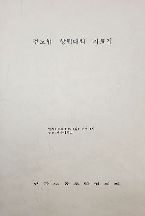 자료집은 축시, 창립선언문, 전노협창립준비위 활동 경과보고, 강령과 규약 안, 1990년 사업계획안, 1990 회계연도 예산안, 투쟁결의문, 국민에게 드리는 글, 세계 노동자에게 보내는 메시지로 구성되었다. 막상 창립대회에 참석한 대의원, 관계자들은 이 자료집을 꼼꼼히 보지 못했을 것이다. 자료집을 기억조차 못할 상황이었기 때문이다. 창립대회 장소는 경희대, 서울대, 제3의 장소 등 어려 곳으로 알려지다가 비밀리에 성균관대학교 자연과학대학 캠퍼스(수원)로 정해졌다. 대의원들은 비밀리에 이동해 창립대회를 치렀다. 노동자와 학생 사수대가 뒤늦게 알고 출동한 경찰병력에 맞서 싸우며 대회를 사수했다. 대회는 빠르게 진행되었다. 폐회도 하기 전에 백골단이 대회장에 곤봉을 휘두르며 몰려들었다. 그 와중에 대의원들은 수배중인 지도부가 대회장을 빠져나갈 때까지 몸으로 막았다. 깔끔하게 보관된 자료집만으로는 상상하기 어렵지만 당시 증언과 함께 자료집을 들여다본다면 긴박한 상황이 느껴질 것이다. 전노협은 창립에 즈음하여 국민에게 드리는 글을 통해 “노동자의 인간다운 삶을 쟁취하는 것뿐만 아니라 경제사회구조의 개혁과 나라의 민주화, 자주화, 평화통일을 실현하기 위해서도 투쟁해 갈 것입니다. ... 우리는 공공임대주택제도의 확립, 무상 의무교육 및 의료보장제도의 확대 실시, 조세 불평등의 제거와 국가 복지재정 지출의 확대 등을 통해 전 국민의 생활조건을 향상시키는 데 전력을 다할 것이며, 온갖 반민주악법과 제도의 철폐로 국민의 민주적 기본권을 확보하고 정치사회의 민주화를 쟁취해 나가고자”했다. 이런 요구를 걸고 투쟁하는 노동자의 전국조직이 발족을 하니 노태우정권이 갑호 비상령을 내려 대응했던 것이다. 이 자료집은 백기완 선생님의 축시 ‘북을 때려라’로 시작한다. 백기완 선생님은 “노동자가 밀리면 사람이 밀리고, 노동자가 패하면 역사가 패”한다는 구절로 노동자가 나갈 길을 일러주셨다. - 전노협 창립 축시 - 북을 때려라 백기완 우리는 모였다 날마다 찢어지던 땀방울 그 속에 어리는 쪼매난 승리 노동해방의 깃발을 들고 우리는 이렇게 모였구나 북을 때려라 가슴을 펴라 우리는 이겼다 또랑물이 샛강이 되고 샛강이 장강이 되듯 몰아치는 저 노동해방의 함성 우리는 이겨야 한다 북을 때려라 보라! 착취의 날인이는 높이 떴지만 하늘을 여는 건 그들이 아니다 북을 때려라 보라! 독재의 칼날은 번득이지만 세상을 여는 건 그들이 아니다 북을 때려라 한손의 망치론 노동을 해방하고 또 한손의 망치론 새날을 비어내는 오, 창조의 전사들이여 손에 손을 잡고 일어나라 노동자가 밀리면 사람이 밀리고 노동자가 패하면 역사가 패하나니 일어서라 천만 노동자여 이제는 변혁의 주인공으로 저 간악한 사기꾼, 독재자, 악덕재벌 그 낙지발 끝장낼 때까지 북을 때려라 북이 없으면 가슴을 때리고 그것마저 다하면 이 캄캄한 한낮을 때려라 노동자의 피눈물이 통하는 세상 일하는 이가 주인되는 세상 그런 세상이 열릴 때까지 북을 때려라 |