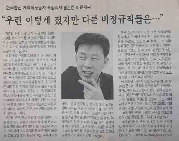 또 짐 싸다 정경원(노동자역사 한내 사무처장) 노동운동역사자료실은 노동자기업경영연구소(노기연)와 공간을 같이 쓰고 있어서 성수동 단독주택 보증금 문제를 해결할 수 있었지만 운영비가 넉넉하지 않았다. 노동운동역사자료실의 수입은 김종배추모사업회 월 회비 40여만 원이 다였다. 그 외 수익구조는 없었다. 자원봉사자 교통비도 제대로 주지 못했지만 자원봉사자의 발길은 끊이지 않았다. 자료실에 상근했던 정경원은 전노협백서를 만든 후 대학원에 진학했다. (대학원 조교로 있으면서 법과대학 역사서를 맡아 만들었다. 이 무슨 일이고~~. 노동법 공부보다 법과대학 역사를 쓰기 위해 선배들을 만나 인터뷰하는 게 더 흥미로웠으니. 그러던 중 김종배 동지가 운명했고 정경원은 졸업 후 다시 자료실로 돌아왔다. ) 노동운동역사자료실은 전태일자료실과 함께 자료정리 방법을 공유하고 목록정리 폼을 맞추는 등 노동운동자료관리를 위한 체계를 갖추려 노력했다. 당시 전태일자료실은 이형숙이 관리하고 있었고 유경순 선생과 정경원 이렇게 셋이 자주 모였다. 이 즈음 민주화운동기념사업회가 만들어져 노동운동자료를 수집하기 시작했다. 민주화운동기념사업회는 성공회대민주자료관, 전태일자료관, 노동운동역사자료실, 영동포산선을 모아 자료 기증을 요청했다. "자료는 그 단체의 정체성을 말하는 것이므로 기증할 수 없다"는 게 단체들의 의견이었다. 자료 기증 대신 통합관리할 수 있는 프로그램을 만들어 제공하면 어느 곳에서든 어떤 단체든 자료를 등록하고 통일적으로 관리할 수 있지 않겠냐는 제안을 했지만 국가 예산으로 하는 사업이라 불가하다는 이야기를 들었다. 두 번의 모임은 그것으로 끝났다. 자료실은 4년을 채우지 못하고 문을 닫았다. 재정 문제로. 그 많은 자료와 책들은 다시 박스에 담겼다. 당진에 있는 양규헌 동지 친척 집, 정경원 친가 등에 자료를 나눠 보관했다. 모빌랙과 책장은 민주노총 정책연구원에 옮겨졌다. 김진균 선생님이 기증하신 도서 일부도 함께. 그리고 나는 민주노총 정책연구원 자료실 상근활동을 시작한다. 노동운동역사자료실이 현재를 기록하자며 발간한 [한국통신계약직노동조합 투쟁백서 517일의 외침] 관련 기사 (한겨레신문 2003.1.31) 전 한통계약직노조 이운재 선전국장의 말처럼 기록을 남기는 이유는 우리는 졌지만 다른 비정규직 노동자들의 투쟁은 승리할 수 있기를 바라는 마음이었다. 2004년엔 어려운 일이 많았다. 노동운동역사자료실 문을 닫았고 우리의 든든한 뒷배였던 김진균 선생님은 세상을 떠나셨다. 선생님은 80년 여름 신군부 집권에 대한 지식인 134인 성명과 서울대 교수 시국 선언문 참여를 이유로 해직당했다. 이후 84년에 복직될 때까지 후학들과 ‘상도연구실’을 설립, 민중운동 이론의 틀을 다졌으며 84년에는 진보적 학자, 현장 노동자가 모여 산업사회연구회를 설립하기도 했다. 88년에는 ‘민주화를 위한 전국 교수협의회’를 설립해 초대의장을 맡았다. 전노협을 옹호하는 전노협지원대책위를 만들고 이후 전노협후원회 회장을 맡으며 물심양면 지원을 아끼지 않으셨다. 94년에는 ‘사회진보연대’ 대표, 99년 ‘진보네트워크’ 대표, 노동자교육센터 대표를 지내는 등 다양한 활동을 벌였다. 선생님은 ‘영원한 청년’이었다. 후배들과 현장 노동자의 이야기를 경청했고 토론하며 학문과 현장을 연결하는 실천을 몸소 보여주셨다. (출처: 대학신문 _ http://www.snunews.com) 선생님은 전노협백서 제작을 제안하셨고 백서 초안을 꼼꼼히 봐주셨다. 지금도 기억에 남는 말씀은 “노동자를 주체로 서술 구조를 바꾸라.”는 말씀이다. 그 말씀이 담고 있는 큰 의미를 시간이 갈수록 곱씹게 된다. 대장암 투병을 하시던 어느 날 선생님이 임영일 선생님과 나를 보자고 하셨다. 황달로 낯빛이 형편없으셨다. 선생님은 노동운동자료실 걱정을 하셨고 두 사람이 잘 해줄 것이라 믿는다 하셨다. 그게 선생님과의 마지막이었다. 이틀 후 선생님은 운명하셨다. 2004년 2월 14일이었다. 2003년 말 민주노총에 정책연구원이 생기고 그 안에 자료실이 설치되었다. 2004년 1월부터 정경원은 민주노총 연구원으로 일했다. 민주노총 설립 이후 자료를 정리하고 회의자료 목록을 만들고 10년 연표를 만들었다. 연간 사업 예산은 200만 원이었다. 협약 맺은 성공회대 학생들이 아니었다면 자료 정리가 불가능했을 것이다. 1987노동자대투쟁 기념 사이트를 개설하고 관련 자료를 모을 수 있었던 것도 단체들의 힘으로 가능했다. 민주노총정책연구원노동운동자료실은 성공회대민주자료관, 노동자의 책, 노동자정보통신지원단2, 노동네트워크, 노동사회교육원 등과 함께 인터넷에서 ‘노동역사관 1987’(http://remember1987.net)을 운영했다. 자료실 문은 닫았지만, 민주노총 조직체계를 가동하여 자료를 수집, 정리할 수 있는 체계를 구축하겠다는 목표가 있었다. 자료 생산과 동시에 보존할 수 있는 최적의 구조라 생각했던 것이다. 하지만 정경원이 이 생각을 접는 데는 그리 오래 걸리지 않았다. 자료를 위한 사람과 예산은 언제나 후순위가 될 수밖에 없었다. 자료를 위한 