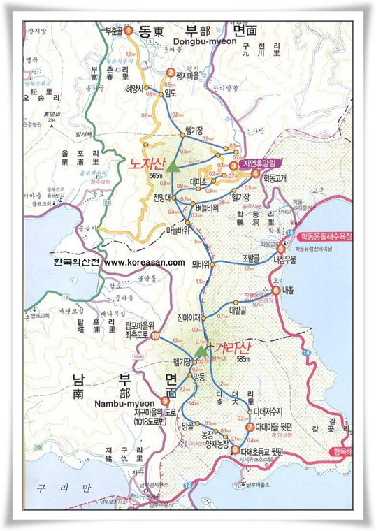 자연휴양림 - 노자산(1.4km) - 전망대(0.8km) - 마늘바위(0.4km) - 뫼바위(1.0km) - 진마아재(1.1km) - 가라산(1.0km) - 저구마을 위 도로변(2.7km), 해양사에서 정상은 2km, 가라산에서 다대마을은 2.5km, 탑포마을은 1.4km.