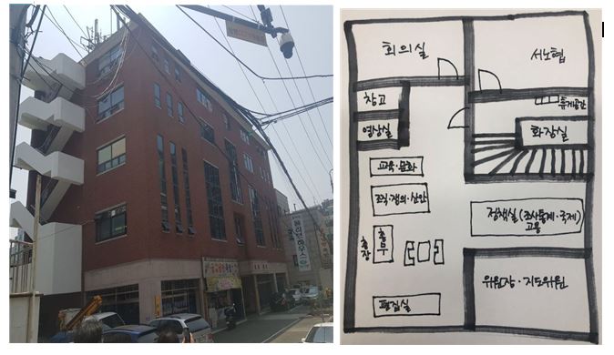 목공과 제본 일로 시작한 전노협백서 발간 정경원(노동자역사 한내 사무처장) 얼마 전 한내 식구들 몇 명이 숭인동을 가봤다. 숭인동과 창신동 일대가 변했다 하니 동원빌딩은 그대로 있는가 궁금해서였다. 종로구 숭인동 56-1 동원빌딩은 전노협과 서노협이 1991년 이사해 1995년 12월 해산할 때까지 있던 건물이다. 전노협 해산 후 전노협백서발간위원회는 전노협 회의실과 서노협 사무실 공간을 튼 곳에 짐을 풀었다. 약 50평 규모의 사무실이었다. 지금은 아파트와 빌딩이 들어서고 지하철역까지 생겼지만 전노협백서발간위원회가 해산한 1997년까지만 해도 발간 벽돌에 초록지붕 동원빌딩이 그 일대에선 눈에 띄는 건물이었다. 동네 한 바퀴 돌고 와서 한내를 기록해야겠다는 생각을 했다. 그 출발은 전노협백서 발간팀이다. 전노협은 조직을 해산하면서 자료정리, 백서발간, 운동사 발간을 결의했다. 6년간의 활동을 정리하고 운동적 평가를 하는 것이 노동운동의 발전을 향한 전노협의 마지막 의무였다. 전노협 임원과 지노협 의장, 전노협후원회 선생님들로 발간위원회를 구성했다. 발간팀은 전노협에 상근하던 김종배와 정경원, 노동자 정치운동을 연구하던 박사과정생 김영수가 함께 일을 시작했다. 전노협 상근자들은 “모든 자료는 자리에 그대로 두고 개인 짐만 챙겨라.”는 지침에 따랐다. 혹여 개인의 판단으로 자료를 유실할 수도 있다는 우려 때문이었을 것이다. 덕분에 몇 명의 동지들이 낡은 철제 책상을 처리하는 일까지 해야했지만. 사무실 한쪽에 셀 수 없이 많은 사과상자가 쌓였다. 600개는 족히 넘을 양이었다. 저 많은 것을 다 정리해야 하는 것인가? 실무자는 세 명인데 백서를 만들 수 있기나 한 것일까? 어디서부터 손을 대야 할 것인가? 실무팀은 백서의 상을 잡기 위한 회의를 했다. 백서는 연대순으로 구성하는 것이 좋겠으나 각 권을 어떻게 구성할 것인가는 자료를 정리하면서 동시에 기획하기로 했다. 팀장이 기획 초안을 작성하기로 하고 김영수와 정경원은 자원봉사자를 모아 자료를 정리하기로 했다. 그런데 문제가 생겼다. 그 많은 자료를 풀어헤쳐 분류 정리할 방법이 떠오르지 않았다. 책자로 제본된 것은 그런대로 괜찮았지만 문서, 낱장 유인물은 답이 보이지 않았다. 암담하던 때 백서팀의 무모한 도전이 시작되었다.  <전노협이 있던 숭인동 동원빌딩 모습과 전노협 사무실 배치도>